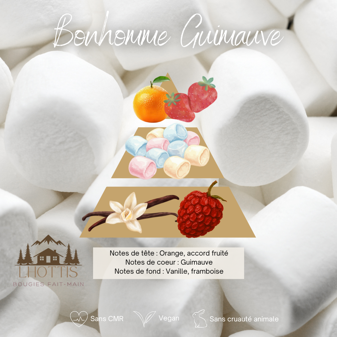 Parfumée à Grasse, elle dévoile une senteur Guimauve tendre et enveloppante, rythmée par :